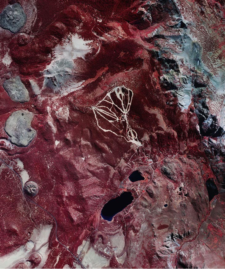 In Above June Lake, Florian Maier-Aichen presents an aerial view of the popular California tourist destination. Trading on the area’s celebrated 5 million year old geological heritage, Maier-Aichen’s photograph transforms the topography into something strangely primitive. Pin point trees, smooth glaciers, and contoured rock connote a biological animation, carved through with vein-like roads, and infectious microscopic houses. Scrutinised with alien perspective, evidence of development and luxury become etched upon the terrain as crude scratchings as the artificial white outline of ski-slopes attain the brutal elegance of cave painting.