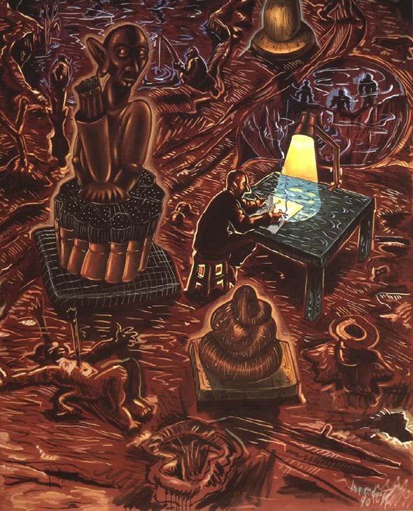Jorg Immendorff presents a canvas divided in three parts: labour, knowledge and possibility. His central figure, a goddess-like woman embodying an owl of wisdom, is the icon nurture and virtue, radiant against the bleak background of storm clouds and darkness. Through her flows a stream of fertility and rebirth in the form of labia-like fruits, proffered from the toil of the rural worker.