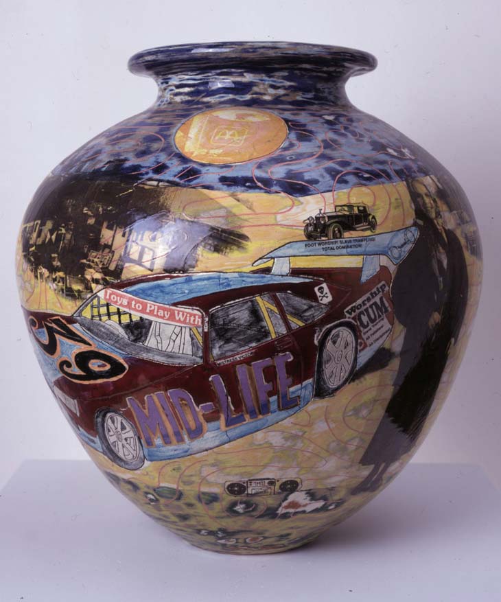 Driven Man Artist: Grayson Perry Facebook Twitter LinkedIn Google + Pinterest VK Tumblr Reddit Xing 1 Grayson Perry uses pots as narrative and figurative media, a round, curved surface for a bizarre or bitter story.2000 39 x 31 x 31 cm