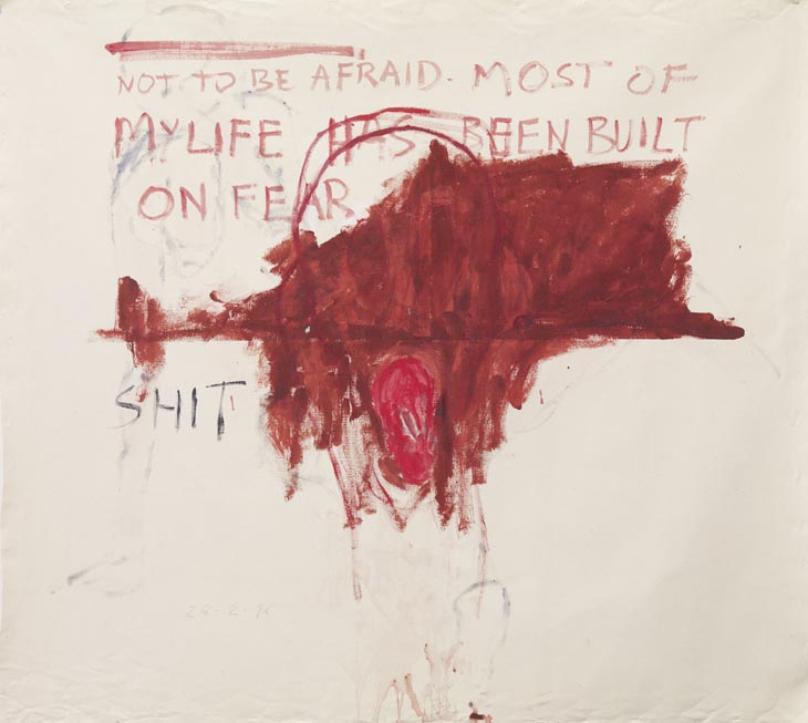 In 1974, Joseph Beuys did a performance called I Love America, and America Loves Me where he lived in a gallery with a wild coyote for seven days as a symbolic act of reconciliation with nature. In 1996, Tracey Emin lived in a locked room in a gallery for fourteen days, with nothing but a lot of empty canvases and art materials, in an attempt to reconcile herself with paintings. Viewed through a series of wide-angle lenses embedded in the walls, Emin could be watched, stark naked, shaking off her painting demons. Starting by making images like the artists she really admired (i.e. Egon Schiele, Edvard Munch, Yves Klein), Emin’s two-week art-therapy session resulted in a massive outpouring of autobiographical images, and the discovery of a style all her own. The room was extracted in its entirety, and now exists as an installation work.