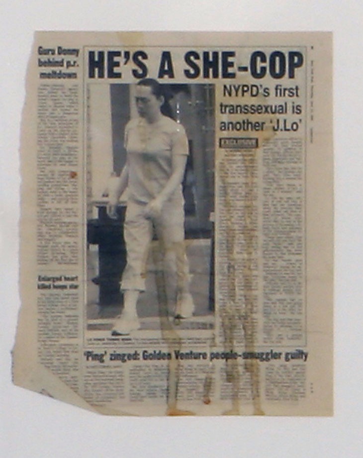 Adopting all the attitude of hip hop posturing, Dash Snow’s Fuck the Police presents a prized collection of newspaper headlines emblazoned with instances cop corruption. Each salacious story is splattered with cum and framed and mounted as a trophy. Wittily combining protest with hard-core bravado, Snow’s installation draws upon fictional connotations to conjure sociopathic images of gangsta persona. In his ballsy statement of counter-culture vehemence, Snow merges Warhol reference with Tarantino sensationalism in humorously pathological display.