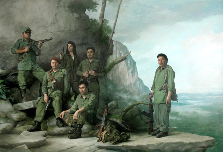 “The group series explores ideas of role play, identity and why people choose to commemorate a collective moment. It is a moment that is ’real’ but also performed and I find that tension interesting to examine. For Sandinistas I was exploring images of extreme environments, and people who operate outside ’civilisation’. Military paintings are traditionally associated with commemoration of victories and the celebration of the State. Painting guerrilla fighters in this way undermines this tradition; they represent something that has (or has been) ’lost’. The figures are painted in a very realistic way so that they are pushed out into our space in direct confrontation, while the background is flat and theatrical, redolent of an anthropological display. The painting is about our understanding and consumption of this type of picture. It presents a fiction that has become an archetypal or generic image that has little to do with the reality of the fighters’ existence.”