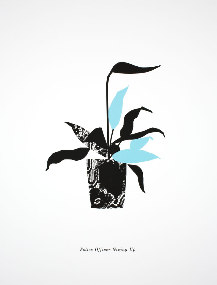 Utilising the aesthetics of graphic art, Matthew Brannon’s work explores the gulf between social ideals and personal crisis. Using screen printing as form of analogue reproduction, Brannon’s images carry both the suggestion of mass replication and aura of original artworks. Directly challenging the void between language and actuality, Brannon often combines text and image to illustrate the potential for dysfunction. In Police Officer Giving Up, Brannon juxtaposes a neutral symbol of a houseplant with a statement of desperation. Exuding the inadequate sentiment of greeting cards, Brannon offers decoration as a feeble mask for emotional depletion.