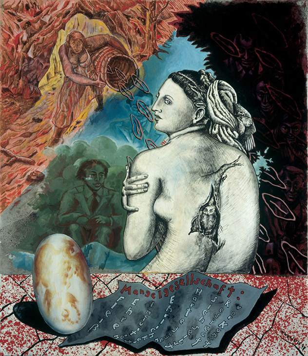 Society of Deficiency is a more gloomy scene: the artist in his studio/toxic wasteland, struggling to create, surrounded by repetitive symbols of Joseph Beuys’ hat and a primitive monument of himself.