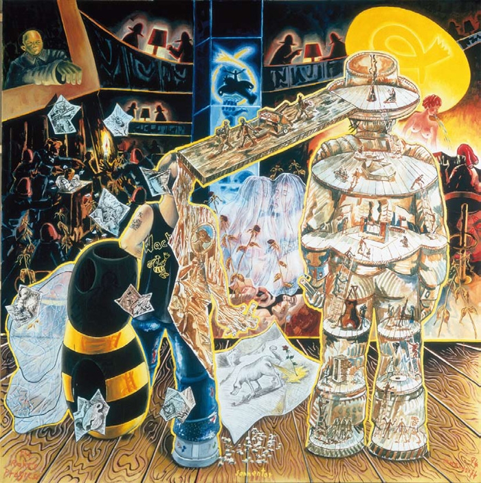 In later paintings Jorg Immendorff turns his concerns to the politics of the art world, drawing reference from and adding to a critical lexicon of art history. In Door to the Sun, his theatre is seen from backstage. The haloed silhouette of his mentor Beuys, dominating the arena, is rendered as a Wizard of Oz construction: not a man, but a museum, being slowly uncrated into the form of Jorg Immendorff. His ice forms, which previously symbolised the freezing decay of a nation, now embody the tools of painting.