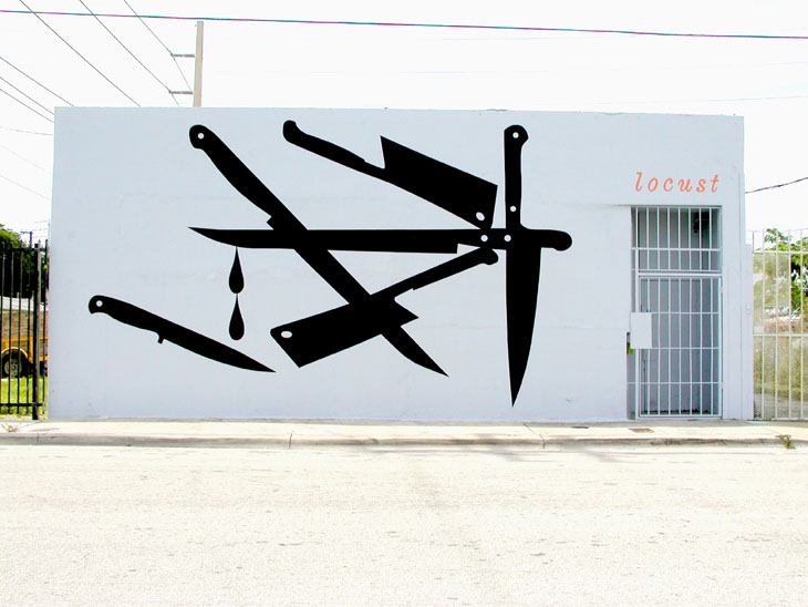 Matthew Brannon’s Switching Positions is executed as a wall mural. Showing an entanglement of knives, Brannon conceives not a logo of violence, but apathy. Rendered in black and dripping ‘blood’, Brannon’s blades are diminished to the international language of pictograph signposting, exuding an outline of ‘idea’ rather than a portent of immediate threat. Through this reduction, Brannon presents content as void: his weapons are represented by a blank vacancy, precariously balanced in harmonious composition. Emblazoned in grand scale, Switching Positions presents an unnerving propaganda of disconsolation and hopelessness.