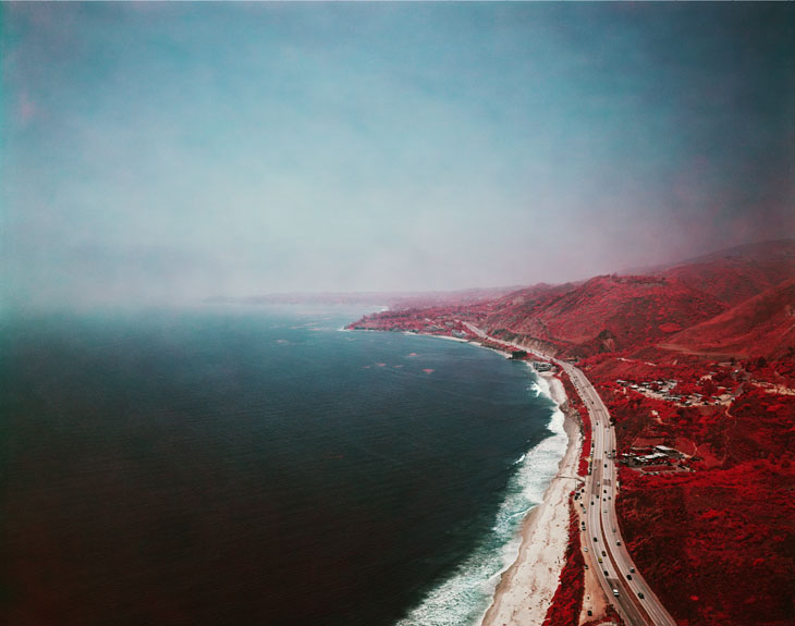 Florian Maier-Aichen’s images reinterpret landscape photography for the 21st century. Often shot at obscure angles or from aerial views, his estranged vantage points are both alien and familiar; a sensation enhanced by his subtle manipulation of the images. Conceiving the representation of sites with a sense of dislocation, Maier-Aichen’s work addresses issues of globalisation and virtual perception. In Untitled, Maier-Aichen’s coastline is far from postcard perfect: a virgin beach lined with superhighway and luxury homes expanding into the misty distance. Tinting the surrounding forest in an unnatural shade of red, he casts an apocalyptic glow over the seascape, framing wilderness and human intervention as a scene of science fiction portent.