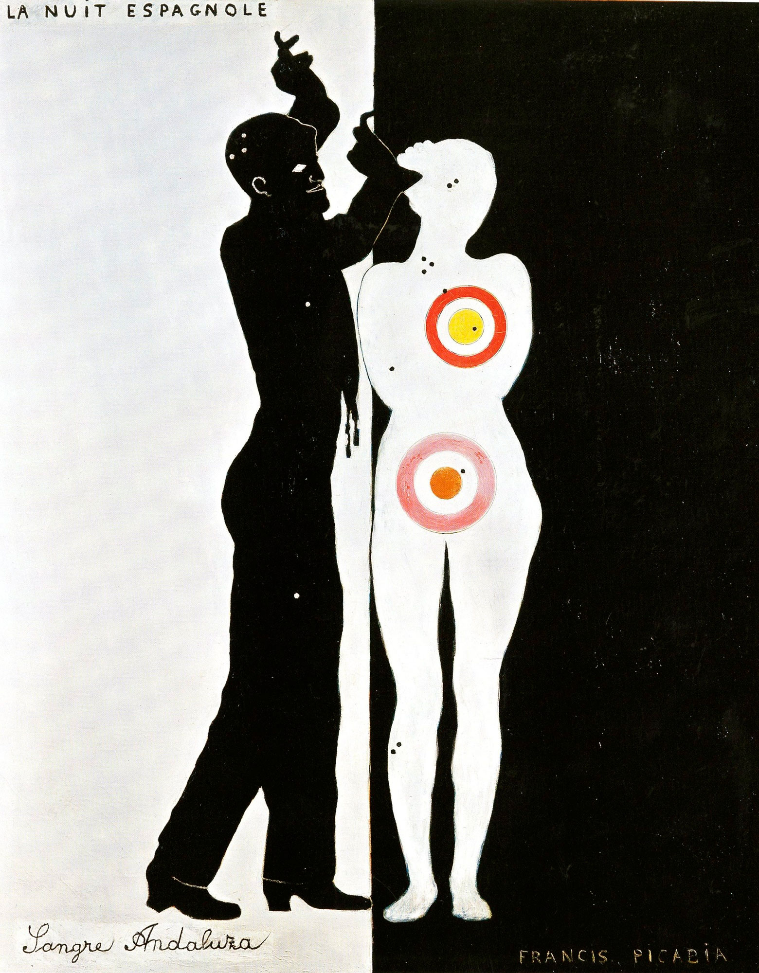 Spanish Night seen herewas produced at the same as his more bizarre creations. This large, boldly graphic work shows the influence of earlier times when he enjoyed working in commercial illustration and graphic design. With his use of black and white enamel paint, Picabia clearly wanted the painting to be as visually impactful as possible.