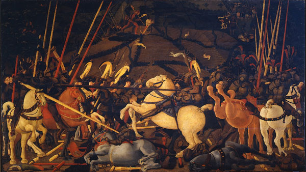 Uccello was probably expected to produce a celebratory portrait of the successful Florentine army officers, but he ignored that notion as being too pedestrian. Instead, he gathered together as many eye witnesses as possible to describe the eight-hour fight, to detail the ebb and flow of the opposing forces, the attacks and counter attacks, the manoeuvring of troops, the reaction of the soldiers during each step of the battle.